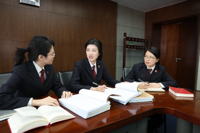 陈禹橦(中)与同事探讨案件办理重点。《方圆》记者张哲摄